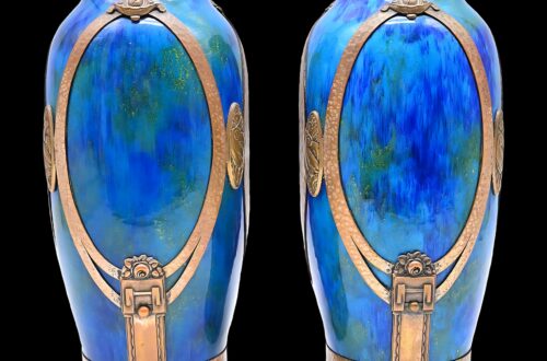 Rapidement reconnue sur la scène internationale, la manufacture fut récompensée lors des expositions universelles de Chicago, San Francisco et Paris. Sa production se distinguait par une palette de glaçures irisées et nacrées, des reliefs en émail appliqués à la main et un répertoire ornemental puisant dans la flore, la faune et les formes aquatiques — autant de caractéristiques qui firent le succès d’Amphora auprès d’une clientèle européenne et américaine fortunée.