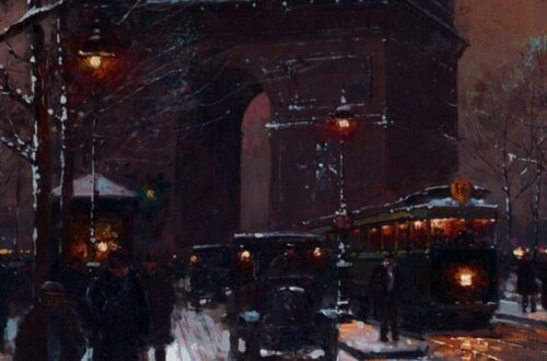Formé à l’École des Beaux-Arts dans l’atelier de Gustave Moreau, l’artiste nantais s’est distingué par une peinture à la fois spirituelle et raffinée, nourrie de références médiévales et renaissantes. Ici, une figure féminine se détache sur un paysage de montagnes enneigées traité en teintes sourdes. Son visage, apaisé et lumineux, est encadré de nattes blondes rehaussées d’une coiffe dorée. Dans un geste d’offrande, ses mains délicates laissent entrevoir trois lys d’or stylisés, symboles de paix et de pureté.