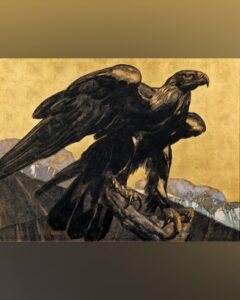 - Aigle impérial🦅 Sur un fond d’or mat, un aigle, massif et silencieux, se dresse sur un rocher tel une sublime idole.