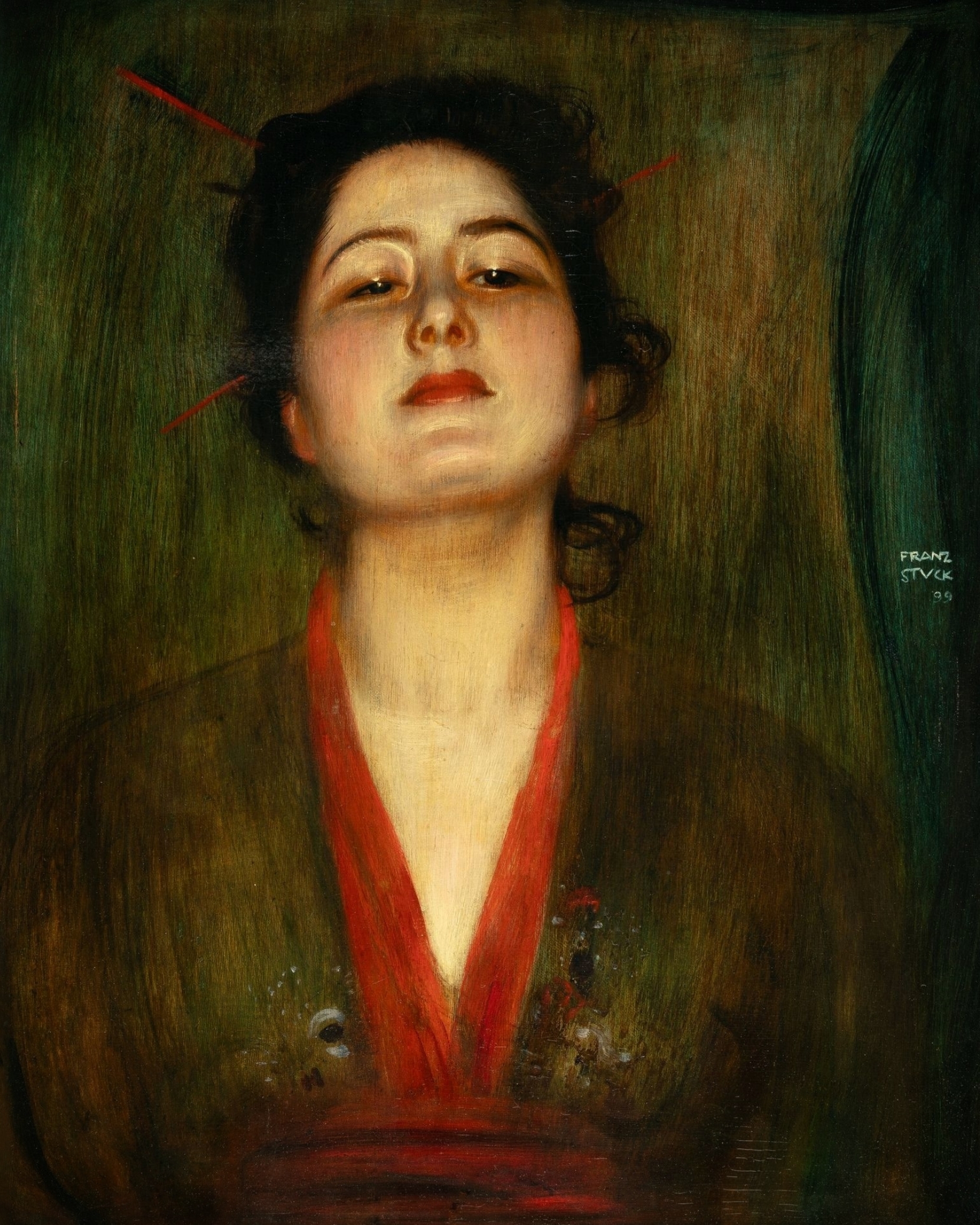 - Portrait de femme à la japonaiseCe troublant tableau illustre l’intérêt marqué de Franz von Stuck pour l’exotisme. 👘