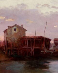 - Coucher de soleilAndrés Larraga y Montaner (1862-1931) saisit un moment simple : la fin du jour sur un petit port aux maisons rustiques. 🌇