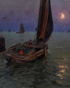 - Retour de pêcheSous un ciel nocturne éclairé par une demi-lune, une petite embarcation en bois rentre au port, voile repliée et matelots à la manœuvre. ⛵